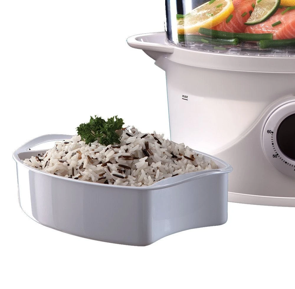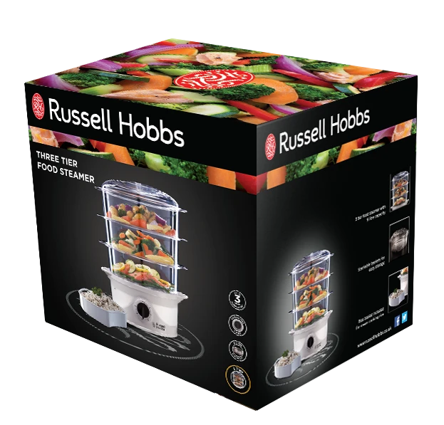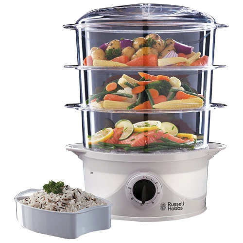 Most food favourites benefit from the steam treatment – it’s a healthier way to cook without adding oils or fat. Meat and fish keeps its flavour and succulence because the steaming process infuses the food, sealing in its natural juiciness and nutritional values. The turbo steam ring design creates a plume of steam in less than 40 seconds and, because steaming is faster and uses less energy than a conventional oven, you can whip up a meal faster without running up your fuel bill. The Russell Hobbs 3 Tier Food Steamer has stacked pots with a total capacity of 9 litres so you can steam different foods simultaneously without having to juggle pots and pans on your cooker hob. It comes complete with a rice bowl for perfectly fluffy rice and egg holders in the baskets so every kind of food is catered for! If you haven’t tried steaming, why not give it a go and look forward to a rainbow selection of fresh healthy foods that are full of flavour and natural goodness.