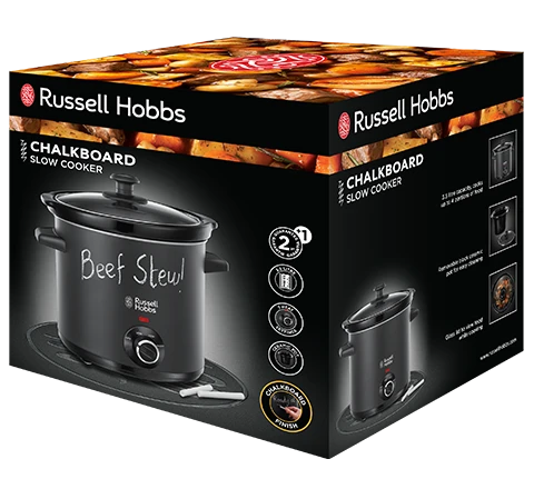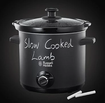 The Russell Hobbs Chalk Board Slow Cooker in stylish Matt Black is a cookpot with a twist. As well as providing all the advanced and clever features that make Russell Hobbs Slow Cookers indispensable, the Chalk Board housing means you can write on it too. Whether you want to leave little notes for the family telling them what’s for dinner or you want to keep track of a recipe – this creative concept will get everyone talking. Perfect for stews, roasts, chillies, soups and more If you’re cooking for up to four people, this family-sized, 3.5 litre cooker really can make your life easier. Not only can you come home to a tasty, nutritious pre-prepared meal, but you don’t have the hassle and mess that comes with using additional pans, grills or the oven. One compact pot does the lot. Considered to be an easier, healthier, more economical way to cook Slow cooked meat can make mealtimes tastier. The gentle cooking action reduces damage to vitamins and retains more of your food’s nutrients and flavours. It makes the most of your budget too because long, slow cooking can tenderise cheaper, tougher cuts of meat, and uses about a quarter of the power of the small ring on the average hob.
