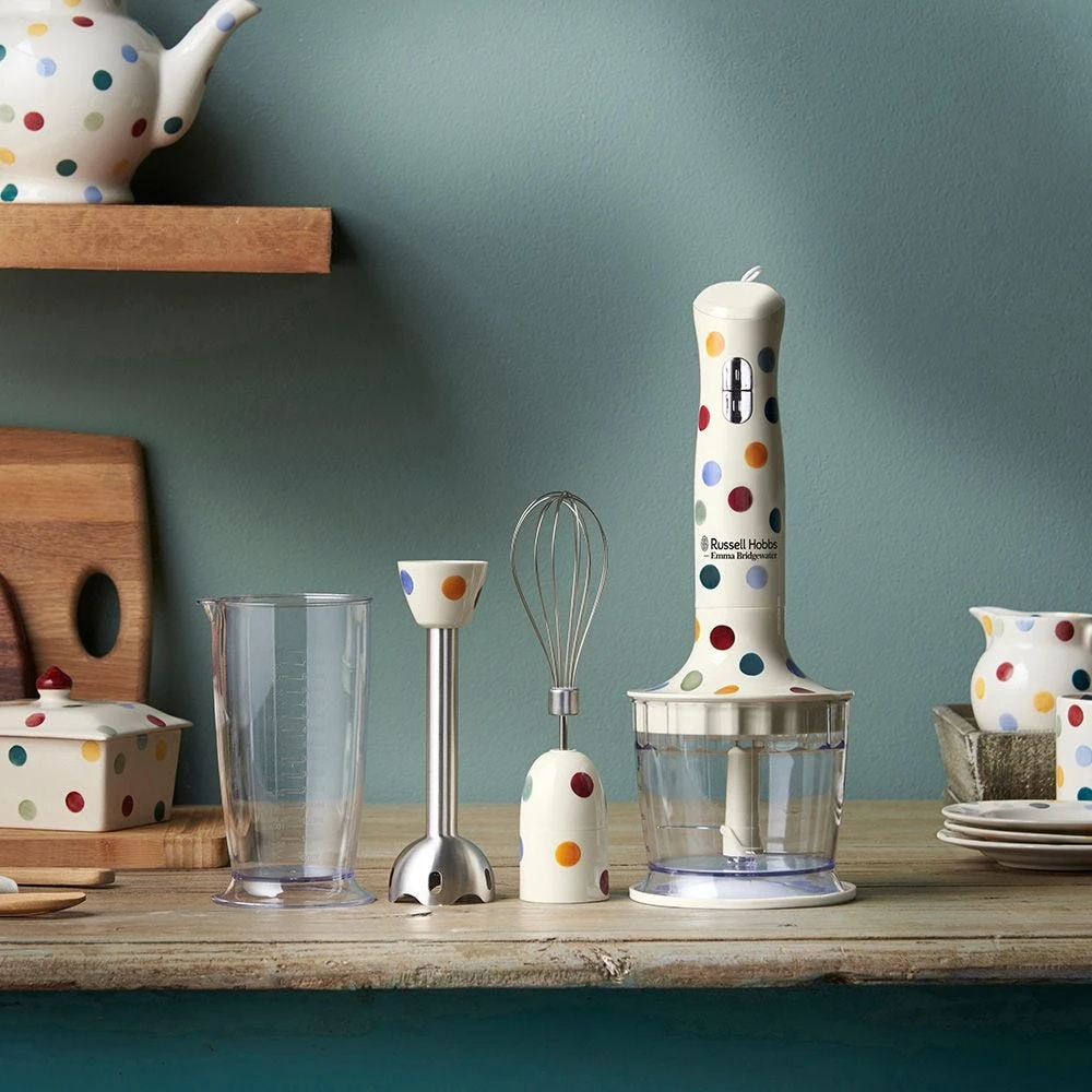Enjoy blissful blending with this beautifully designed Emma Bridgewater Hand Blender. Its bright, bold Polka Dot Design makes it so striking, you’ll never want to put it away. It’s variety of attachments let you Blend, Chop and Whisk and you can choose from 2 Speed Settings and a Pulse Function. Whatever recipe you’re making, enjoy fast and powerful results, thanks to its 500W and 12,000 Rotations per Minute. Promotional offer runs 01/03/22 – 31/03/22. Subject to availability.