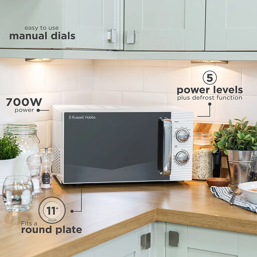 This attractive appliance is simple and easy to use with its 700 watts of microwave power, providing you quick and convenient cooking in your home. This microwave fits a round dinner plate up to 11″ (26.5cm). It also comes complete with a 24.5cm glass turntable, which is dishwasher safe for easy cleaning.
