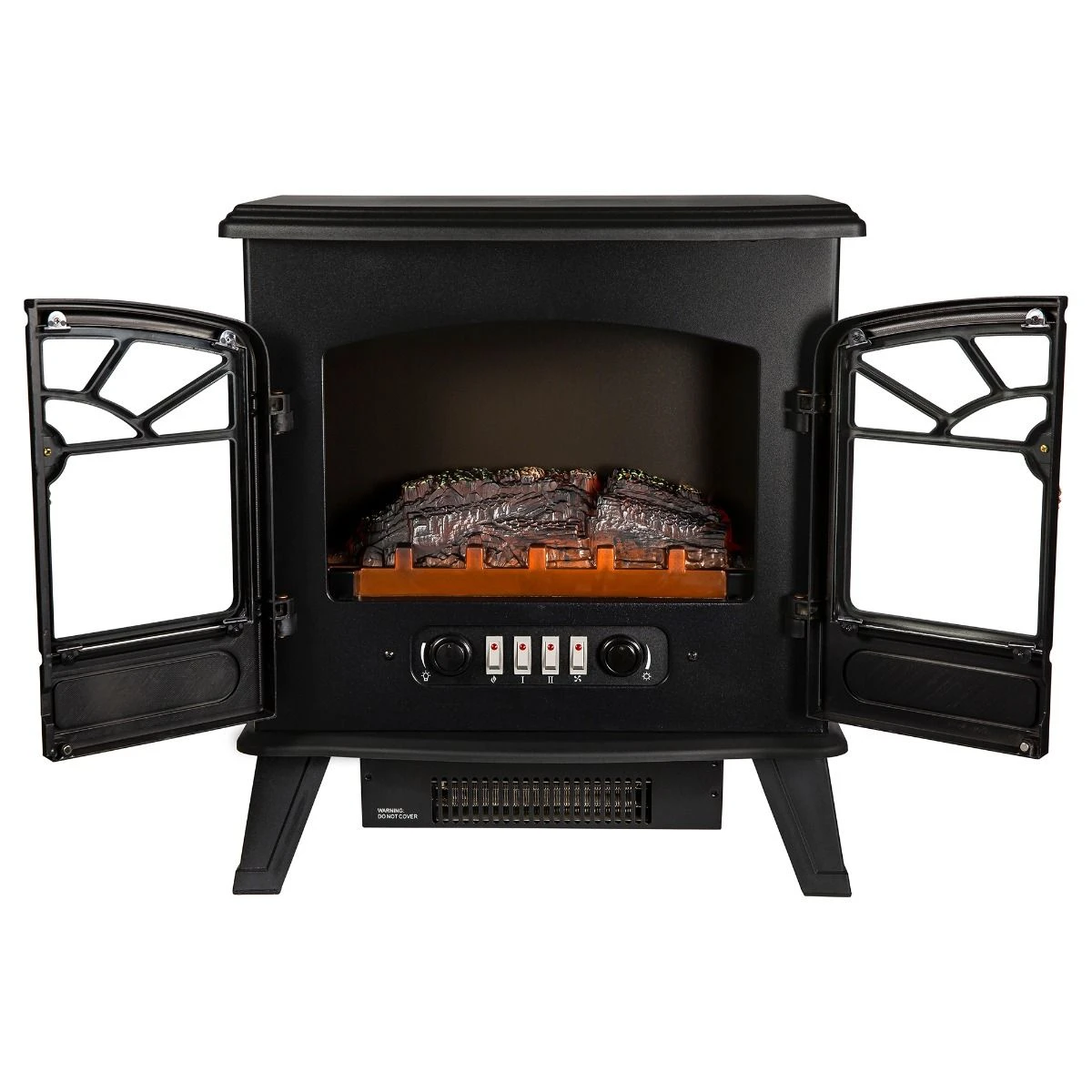 This heater is the perfect addition to your living area – the black painted body with double doors is designed to look like cast iron, but without the weight, and the electronic controls are concealed beneath a flip-down panel.