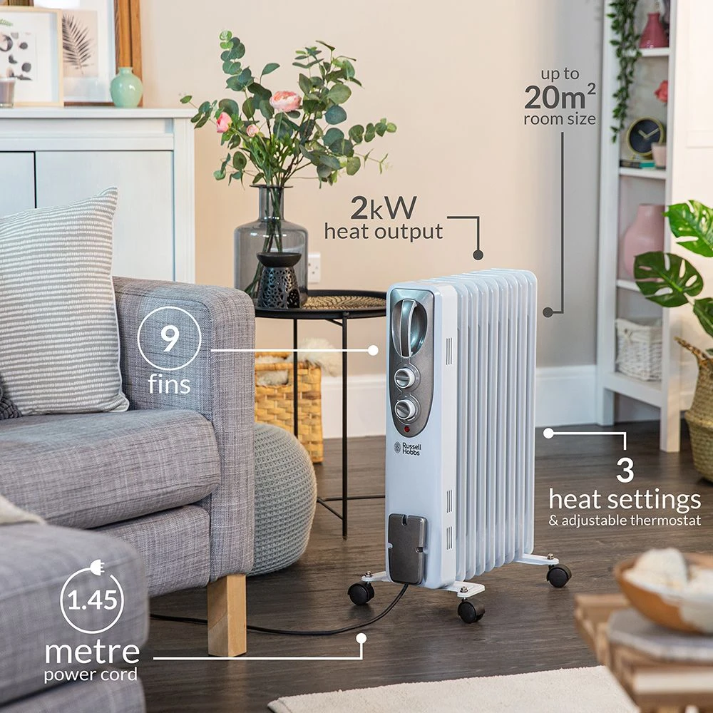 This 2kW oil filled radiator is ideal for warming spaces up to 20m2, perfect for rooms up to the size of a small living room or bedroom. The 9 fins are designed for even heat distribution.