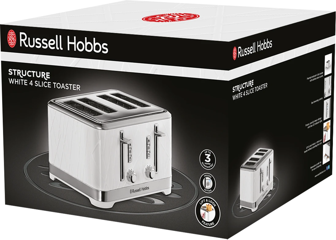 The Structure White 4 Slice Toaster combines quality performance with lasting design. In a Premium Textured White Plastic with Stainless Steel Accents, this toaster stands out on every counter. With Lift and Look and Dual Browning Controls, you can enjoy your toast the way you like it – because nothing beats those home comforts. And its 3 Functions: Frozen, Reheat and Cancel take care of the rest.